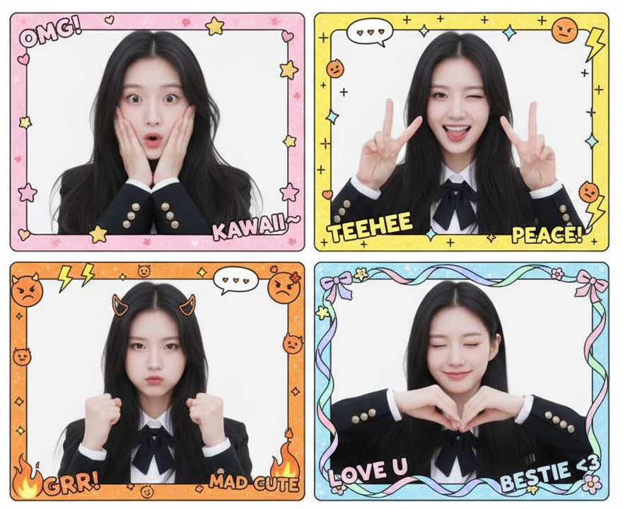 生成大头贴四宫格,每张照片都要有不同的表情和动作,动作要夸张,每张图的周边都是大头贴的边框和贴纸装饰。